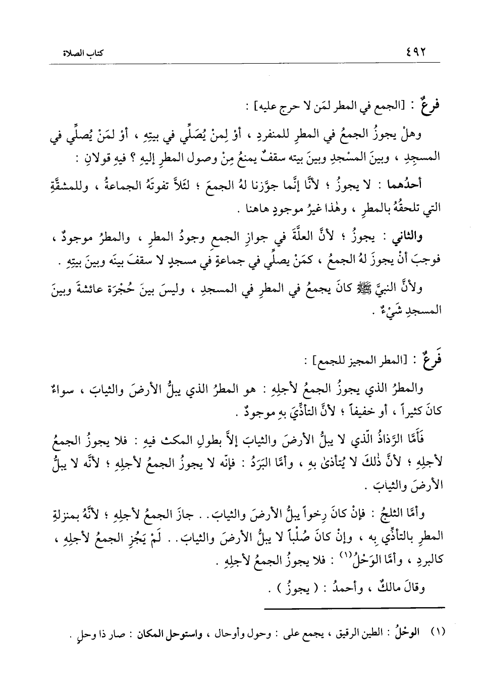 وأما الثلج: فإن كان رخوًا يبل الأرض والثياب جاز الجمع لأجله؛ لأنه بمنزلة المطر بالتأذي به، وإن كان صلبًا لا يبل الأرض والثياب لم يجز الجمع لأجله كالبرد، وأما الوحل: فلا يجوز الجمع لأجله.