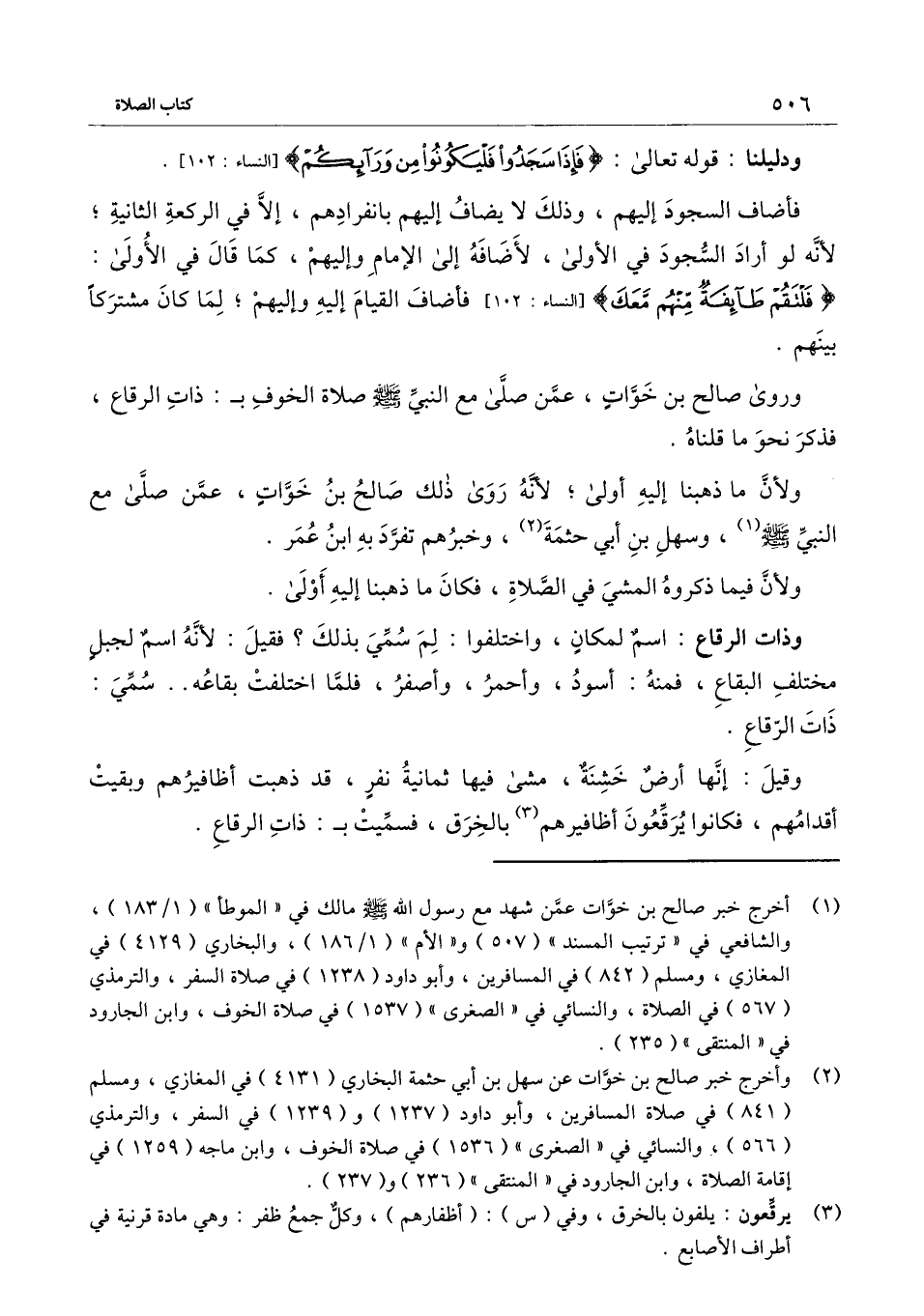 وقيل: إنها أرض خشنة، مشى فيها ثمانية نفر، قد ذهبت أظافيرهم، وبقيت أقدامهم، فكانوا يرقعون أظافيرهم بالخرق، فسميت بذات الرقاع.