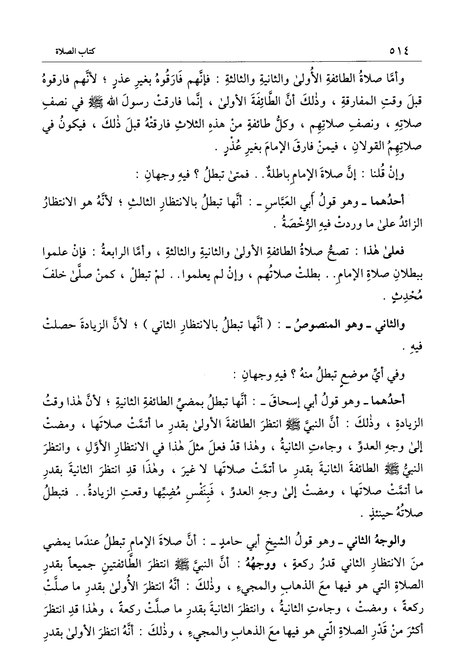 والوجه الثاني - وهو قول الشيخ أبي حامد -: أن صلاة الإمام تبطل عندما يمضي من الانتظار الثاني قدر ركعة، ووجهه: أن النبي - صَلَّى اللَّهُ عَلَيْهِ وَسَلَّمَ - انتظر الطائفتين جميعًا بقدر الصلاة التي هو فيها مع الذهاب والمجيء، وذلك: أنه انتظر الأولى بقدر ما صلت ركعة، ومضت، وجاءت الثانية، وانتظر الثانية بقدر ما صلت ركعة، وهذا قد انتظر أكثر من قدر الصلاة التي هو فيها مع الذهاب والمجيء، وذلك: أنه انتظر الأولى بقدر