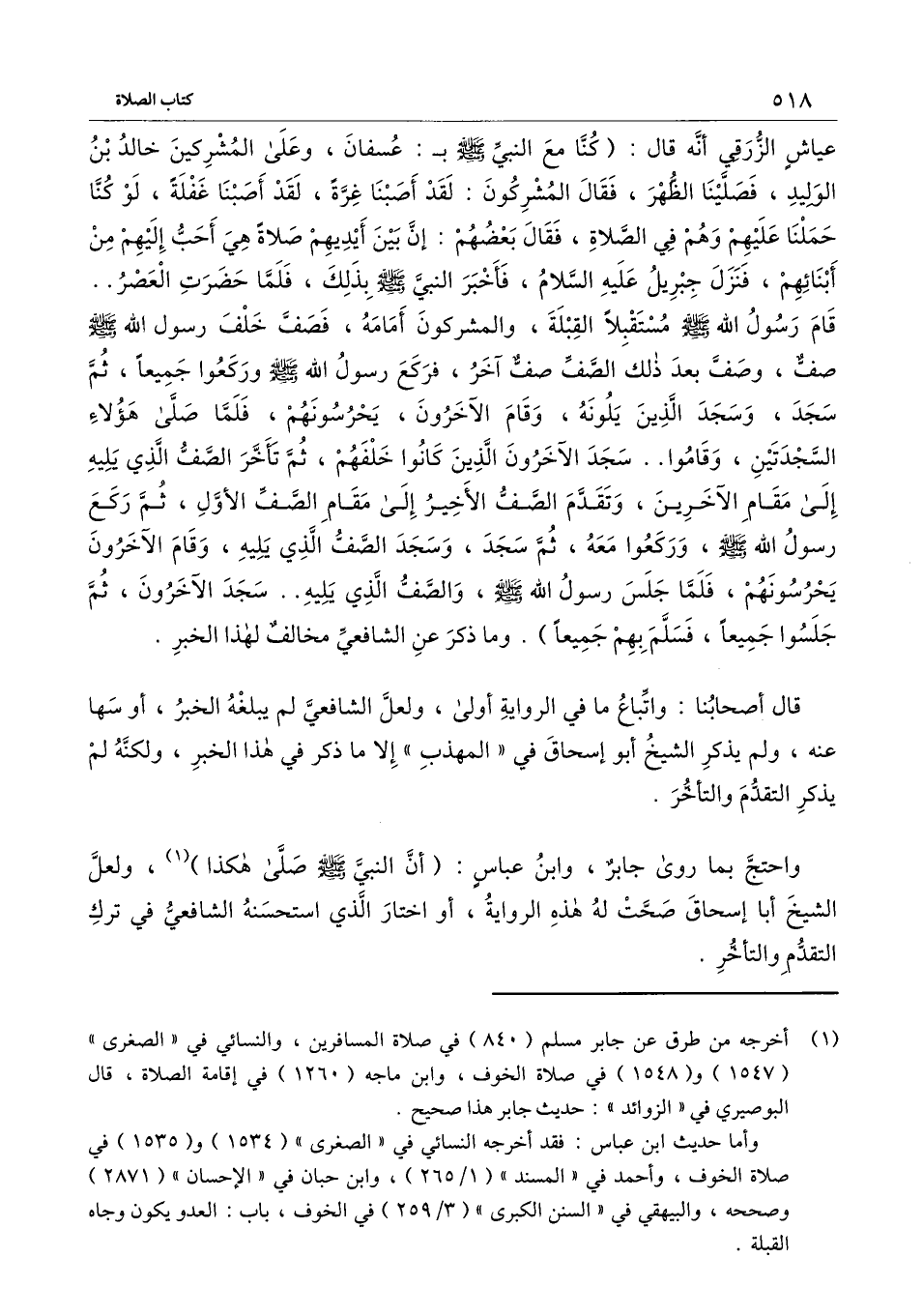 عياش الزرقي أنه قال: «كنا مع النبي - صَلَّى اللَّهُ عَلَيْهِ وَسَلَّمَ - بـ: عسفان، وعلى المشركين خالد بن الوليد، فصلينا الظهر، فقال المشركون: لقد أصبنا غرة، لقد أصبنا غفلة، لو كنا حملنا عليهم السلاح وهم في الصلاة، فقال بعضهم: إن بين أيديهم صلاة هي أحب إليهم من أبنائهم، فنزل جبريل - عَلَيْهِ السَّلَامُ -، فأخبر النبي - صَلَّى اللَّهُ عَلَيْهِ وَسَلَّمَ - بذلك، فلما حضرت العصر.. قام رسول الله - صَلَّى اللَّهُ عَلَيْهِ وَسَلَّمَ - مستقبلًا القبلة، والمشركون أمامه، فصف خلف رسول الله - صَلَّى اللَّهُ عَلَيْهِ وَسَلَّمَ - صف، وصف بعد ذلك الصف صف آخر، فركع رسول الله - صَلَّى اللَّهُ عَلَيْهِ وَسَلَّمَ - وركعوا جميعًا، ثم سجد، وسجد الذين يلونه، وقام الآخرون، يحرسونهم، فلما صلى هؤلاء السجدتين، وقاموا.. سجد الآخرون الذين كانوا خلفهم، ثم تأخر الصف الذي يليه إلى مقام الآخرين، وتقدم الصف الأخير إلى مقام الصف الأول، ثم ركع رسول الله - صَلَّى اللَّهُ عَلَيْهِ وَسَلَّمَ -، وركعوا معه، ثم سجد، وسجد الصف الذي يليه.. وقام الآخرون يحرسونهم، فلما جلس رسول الله - صَلَّى اللَّهُ عَلَيْهِ وَسَلَّمَ -، والصف الذي يليه.. سجد الآخرون، ثم جلسوا جميعًا، فسلم بهم جميعًا» . وما ذكر عن الشافعي مخالف لهذا الخبر.