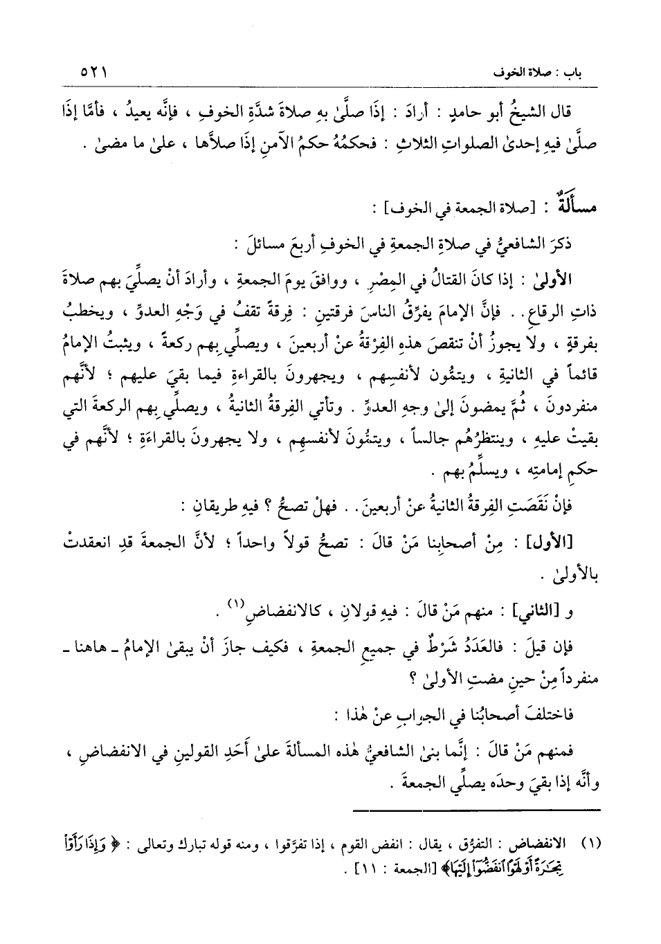 ] : ذكر الشافعي في صلاة الجمعة في الخوف أربع مسائل:
