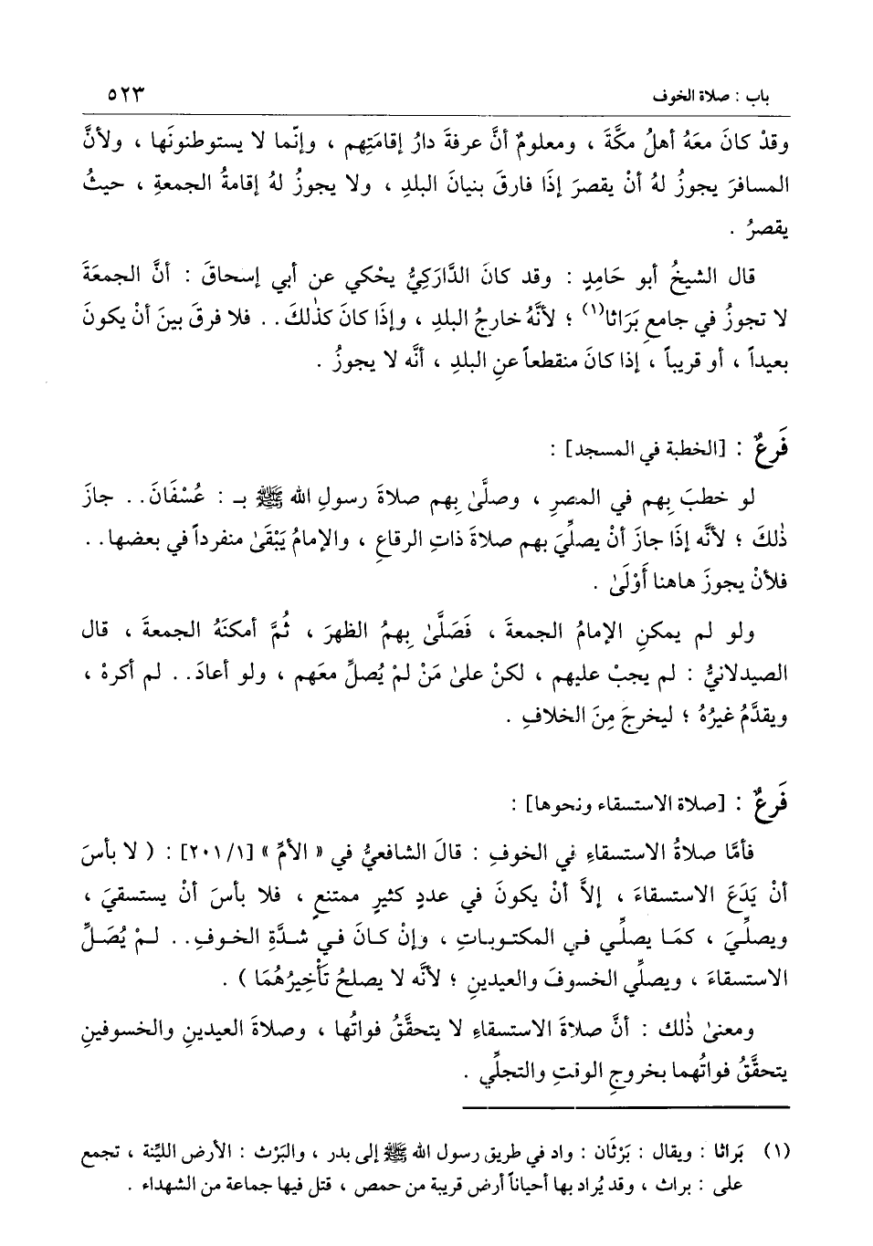 لو خطب بهم في المصر، وصلى بهم صلاة رسول الله - صَلَّى اللَّهُ عَلَيْهِ وَسَلَّمَ - بـ: عسفان.. جاز ذلك؛ لأنه إذا جاز أن يصلي بهم صلاة ذات الرقاع، والإمام يبقى منفردًا في بعضها.. فلأن يجوز هاهنا أولى.