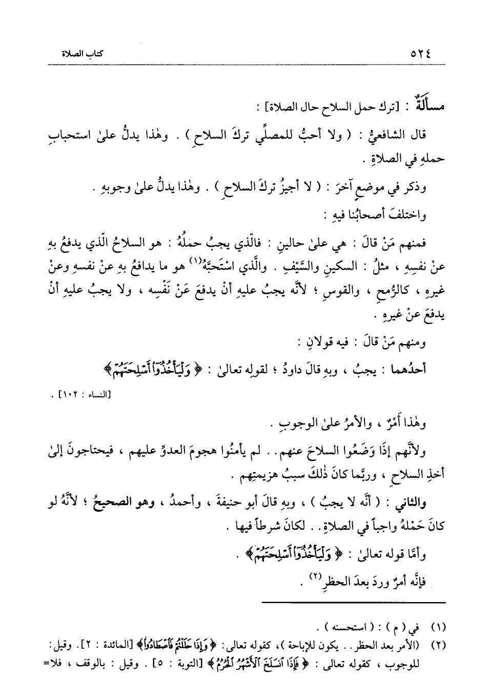 وأما قَوْله تَعَالَى: {وَلْيَأْخُذُوا أَسْلِحَتَهُمْ} [النساء: 102] .