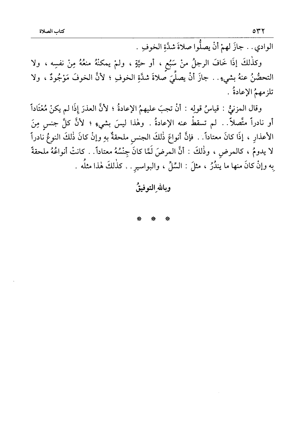 وقال المزني: قياس قوله: أن تجب عليهم الإعادة؛ لأن العذر إذا لم يكن معتادًا أو نادرًا متصلًا.. لم تسقط عنه الإعادة، وهذا ليس بشيء؛ لأن كل جنس من الأعذار، إذا كان معتادًا.. فإن أنواع ذلك الجنس ملحقة به وإن كان ذلك النوع نادرًا لا يدوم، كالمرض، وذلك: أن المرض لما كان جنسه معتادًا.. كانت أنواعه ملحقة به وإن كان منها ما يندر، مثل: السل، والبواسير.. كذلك هذا مثله.