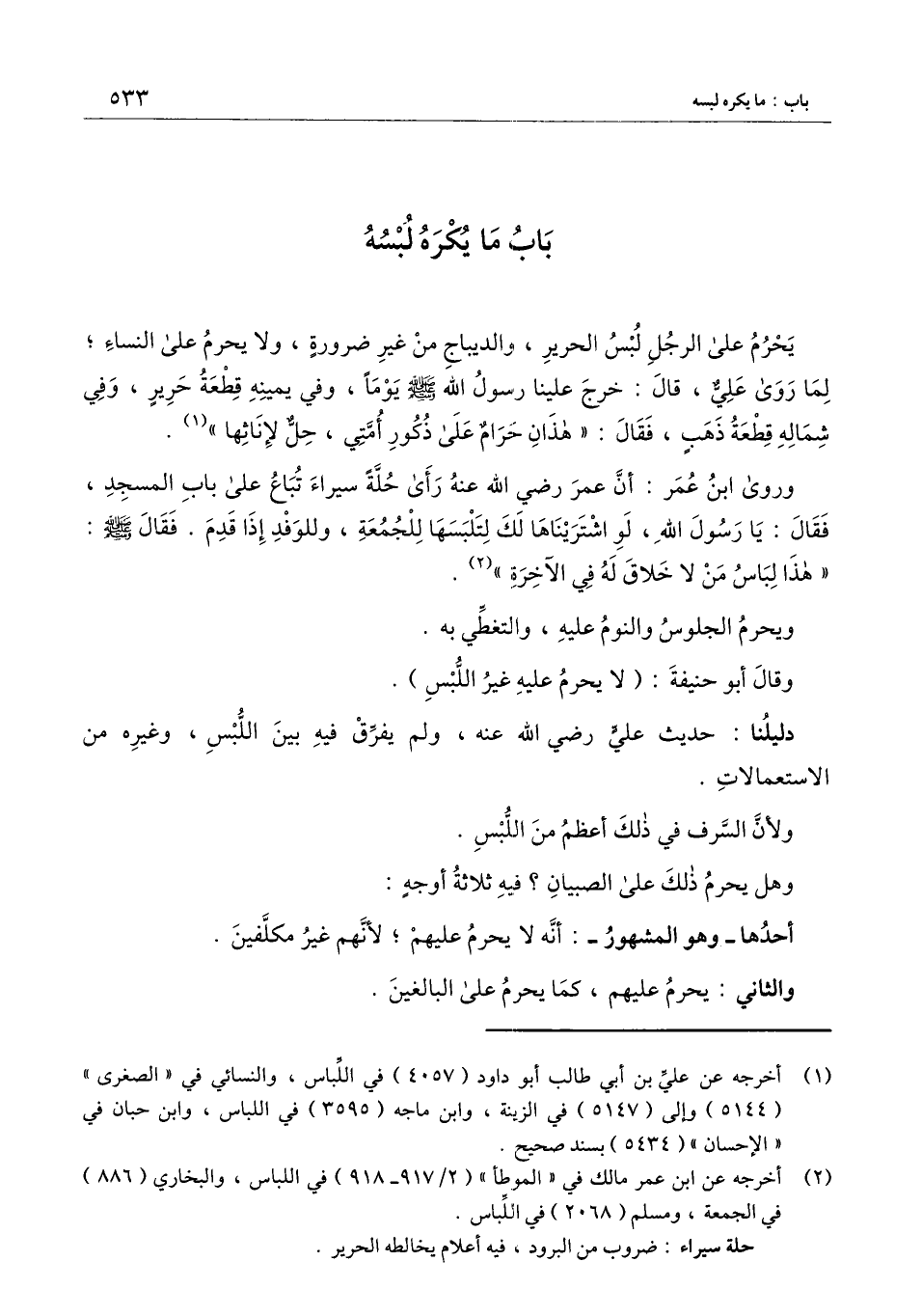 وروى ابن عمر: «أن عمر - رَضِيَ اللَّهُ عَنْهُ - رأى حلة سيراء تباع على باب المسجد، فقال: يا رسول الله، لو اشتريناها لك لتلبسها للجمعة، وللوفد إذا قدم، فقال - صَلَّى اللَّهُ عَلَيْهِ وَسَلَّمَ -: "هذا لباس من لا خلاق له في الآخرة»