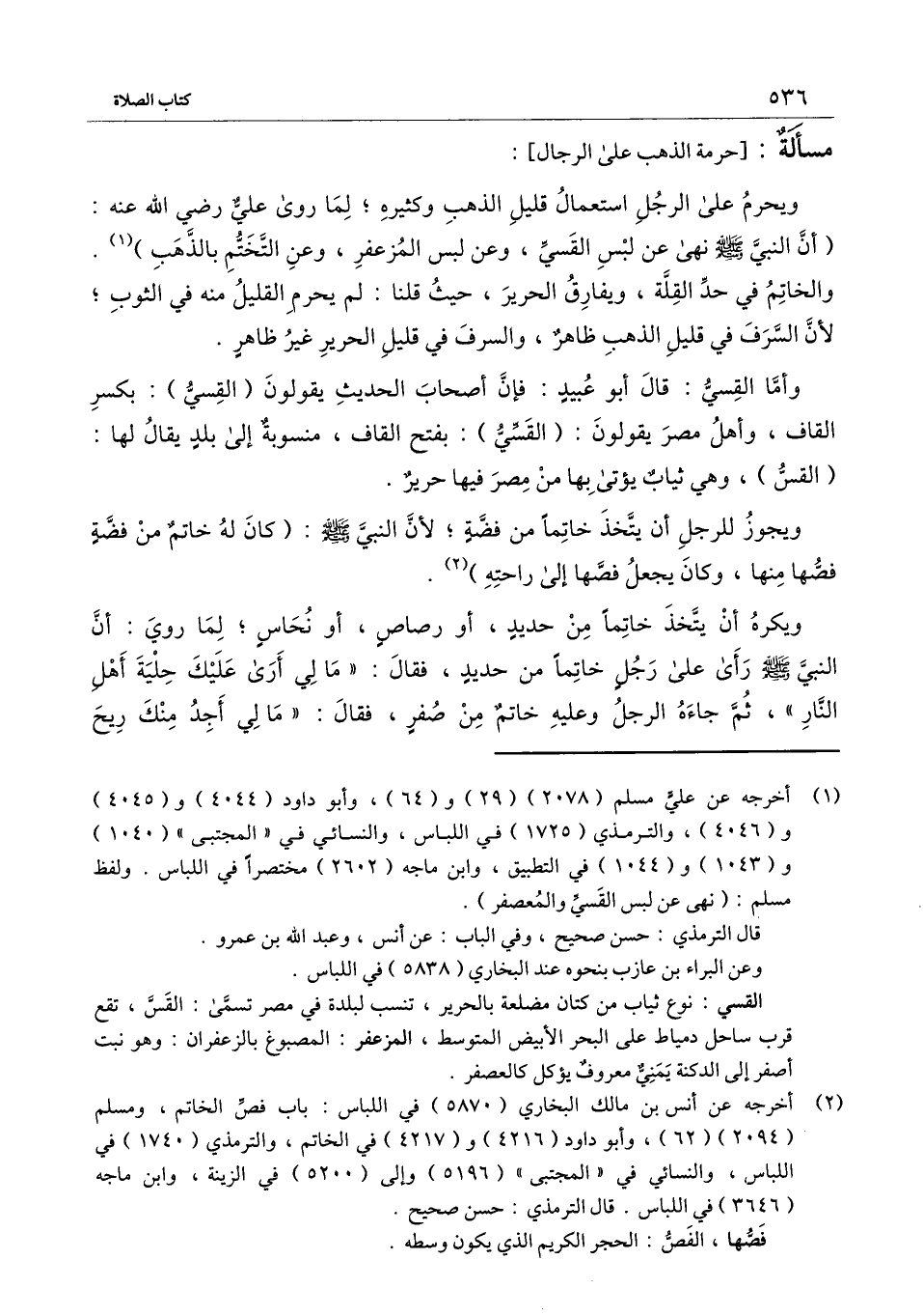 ] : ويحرم على الرجل استعمال قليل الذهب وكثيره؛ لما روى علي - رَضِيَ اللَّهُ عَنْهُ -: «أن النبي - صَلَّى اللَّهُ عَلَيْهِ وَسَلَّمَ - نهى عن لبس القسي، وعن لبس المزعفر، وعن التختم بالذهب» .