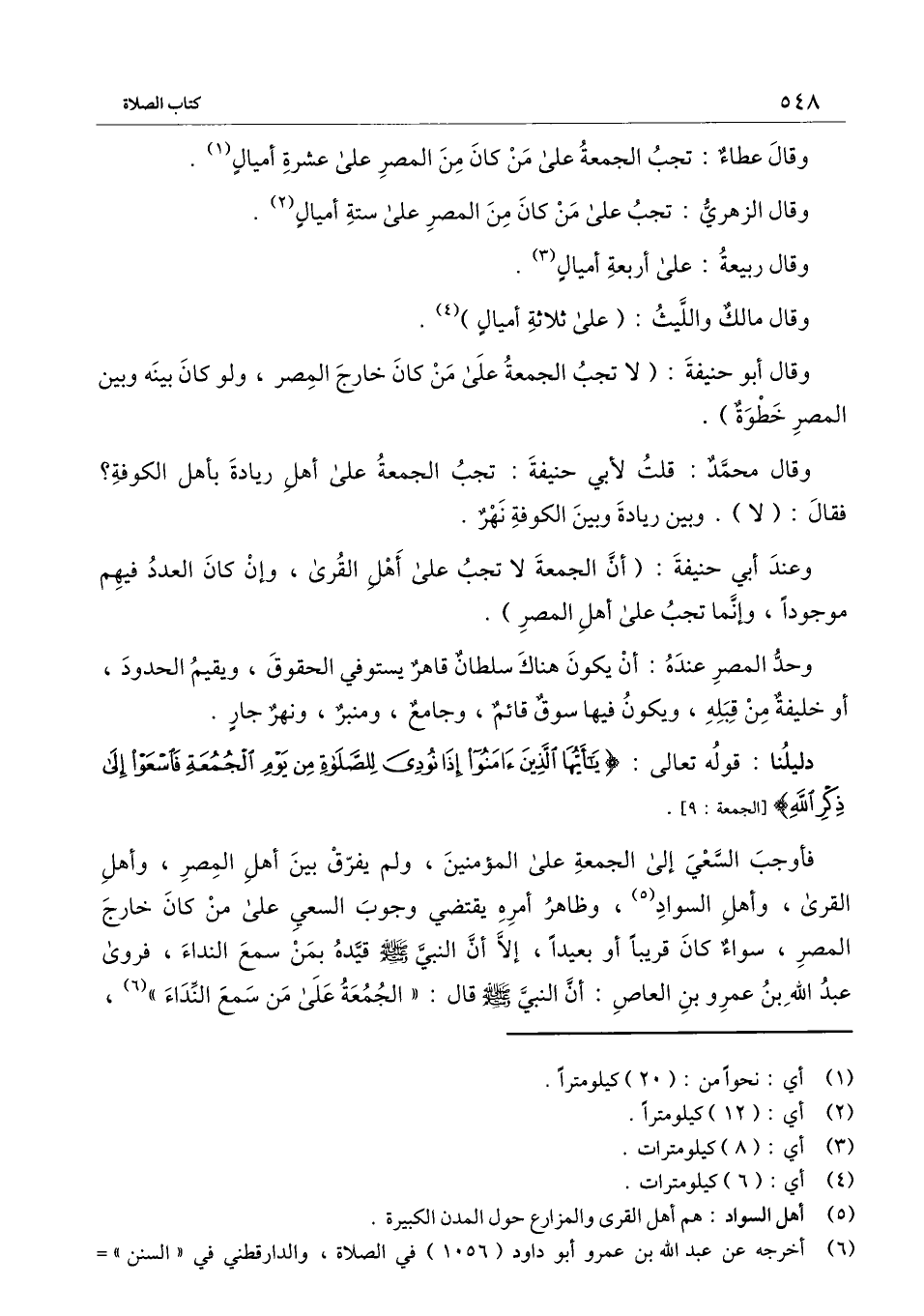 فأوجب السعي إلى الجمعة على المؤمنين، ولم يفرق بين أهل المصر، وأهل القرى، وأهل السواد، وظاهر أمره يقتضي وجوب السعي على من كان خارج المصر، سواء كان قريبًا أو بعيدًا، إلا أن النبي - صَلَّى اللَّهُ عَلَيْهِ وَسَلَّمَ - قيده بمن سمع النداء، فروى عبد الله بن عمرو بن العاص: أن النبي - صَلَّى اللَّهُ عَلَيْهِ وَسَلَّمَ - قال: «الجمعة على من سمع النداء» ،
