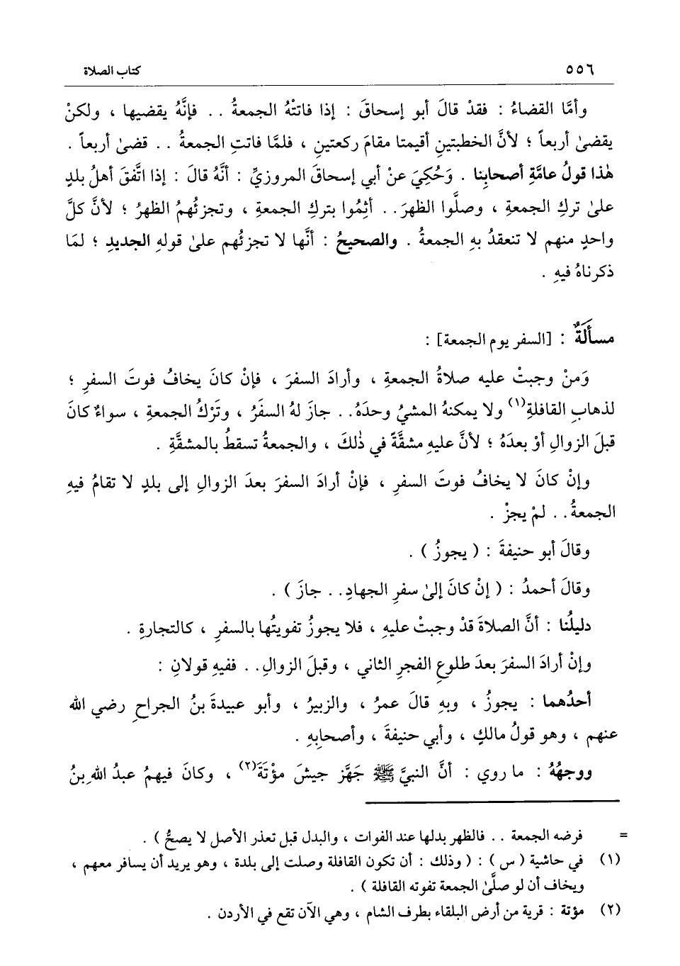 ومن وجبت عليه صلاة الجمعة، وأراد السفر، فإن كان يخاف فوت السفر؛ لذهاب القافلة ولا يمكنه المشي وحده ... جاز له السفر، وترك الجمعة، سواء كان قبل الزوال أو بعده؛ لأن عليه مشقة في ذلك، والجمعة تسقط بالمشقة.