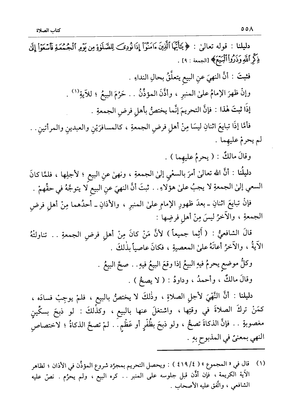 دليلنا: أن النهي لأجل الصلاة، وذلك لا يختص بالبيع، فلم يوجب فساده، كمن ترك الصلاة في وقتها، واشتغل عنها بالبيع، وكذلك: لو ذبح بسكين مغصوبة ... فإن الذكاة تصح، ولو ذبح بظفر أو عظم