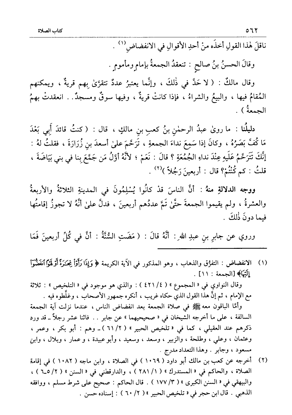 ووجه الدلالة منه: أن الناس قد كانوا يسلمون في المدينة الثلاثة والأربعة والعشرة، ولم يقيموا الجمعة حتى تم عددهم أربعين، فدل على أنه لا تجوز إقامتها فيما دون ذلك.