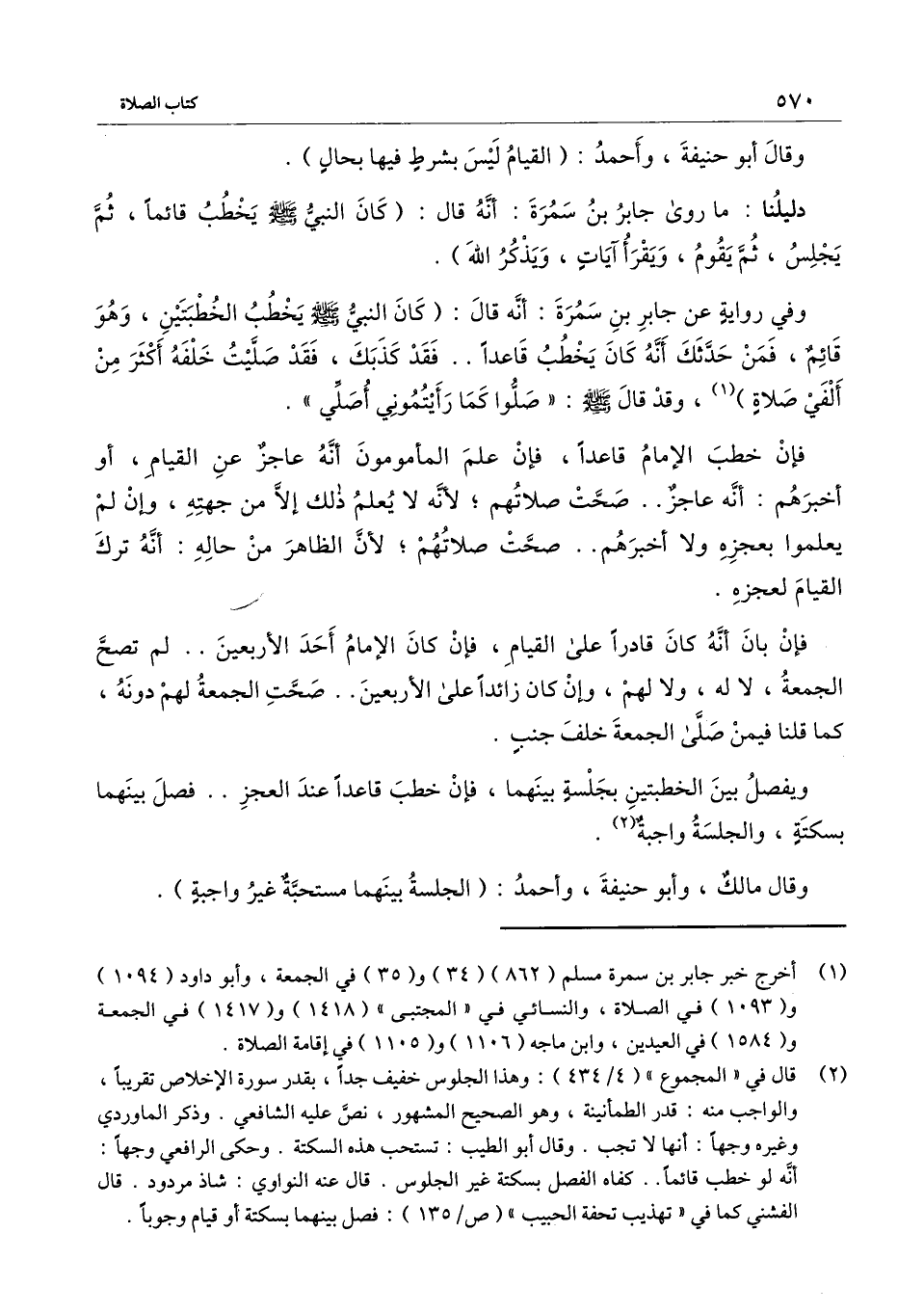وفي رواية عن جابر بن سمرة: أنه قال: «كان النبي - صَلَّى اللَّهُ عَلَيْهِ وَسَلَّمَ - يخطب الخطبتين، وهو قائم، فمن حدثك أنه كان يخطب قاعدًا ... فقد كذبك، فقد صليت خلفه أكثر من ألفي صلاة» ، وقد قال - صَلَّى اللَّهُ عَلَيْهِ وَسَلَّمَ -: «صلوا كما رأيتموني أصلي» .