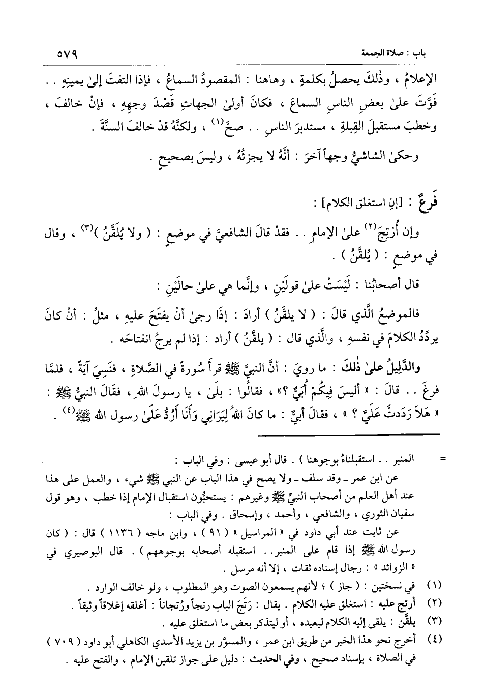 الإعلام، وذلك يحصل بكلمة، وهاهنا: المقصود السماع، فإذا التفت إلى يمينه ... فوت على بعض الناس السماع، فكان أولى الجهات قصد وجهه، فإن خالف، وخطب مستقبل القبلة، مستدبر الناس