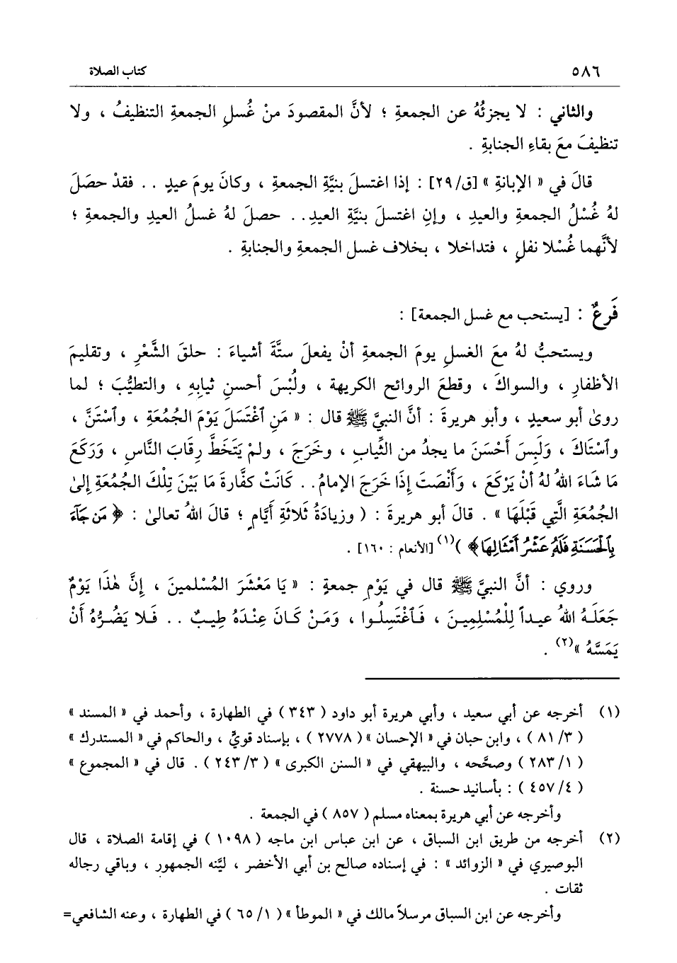 وروي: «أن النبي - صَلَّى اللَّهُ عَلَيْهِ وَسَلَّمَ - قال في يوم الجمعة: "يا معشر المسلمين، إن هذا يوم جعله الله عيدًا للمسلمين، فاغتسلوا، ومن كان عنده طيب ... فلا يضره أن يمسه» .