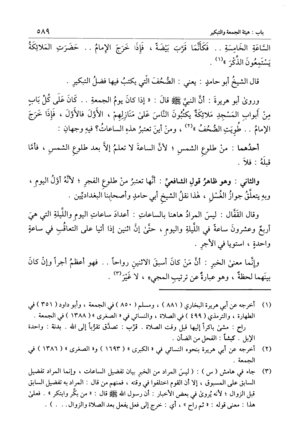 قال الشيخ أبو حامد: يعني: الصحف التي يكتب فيها فضل التبكير.