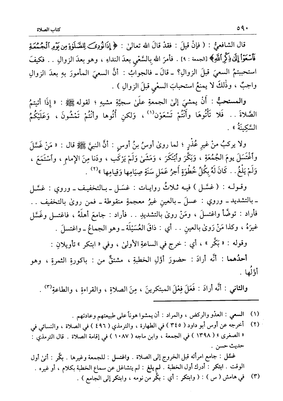 قال الشافعي: (فإن قيل: فقد قال الله تعالى: {إِذَا نُودِيَ لِلصَّلاةِ مِنْ يَوْمِ الْجُمُعَةِ فَاسْعَوْا إِلَى ذِكْرِ اللَّهِ} [الجمعة: 9] [الجمعة:9] . فأمر الله بالسعي بعد النداء، وهو بعد الزوال ... فكيف استحببتم السعي قبل الزوال؟ -قال - فالجواب: أن السعي المأمور به بعد الزوال واجب، وذلك لا يمنع استحباب السعي قبل الزوال) .