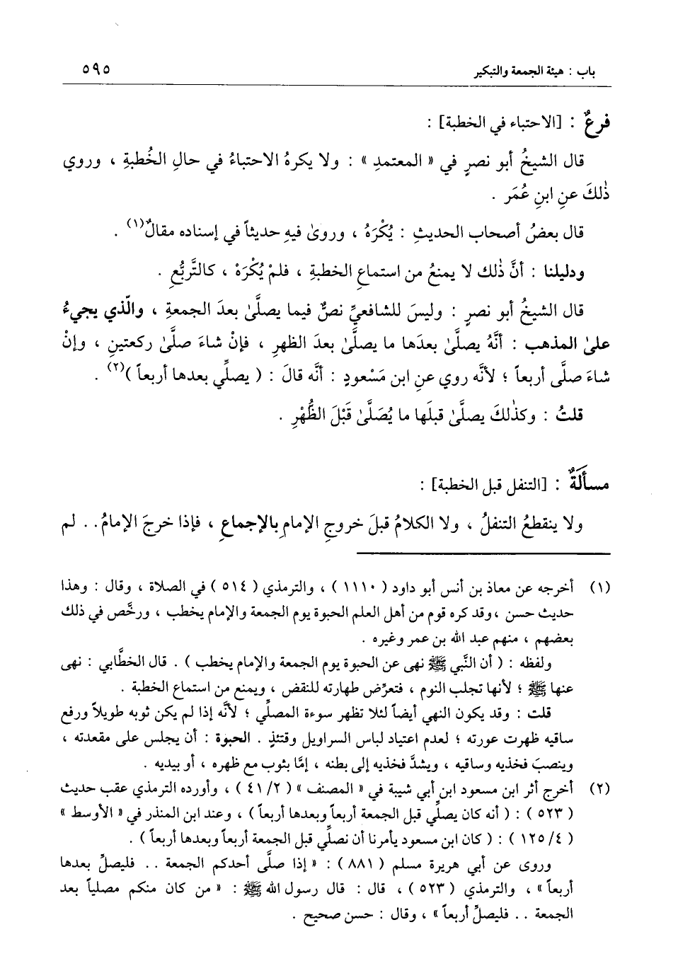 قال الشيخ أبو نصر في " المعتمد ": ولا يكره الاحتباء في حال الخُطبة، وروي ذلك عن ابن عمر.