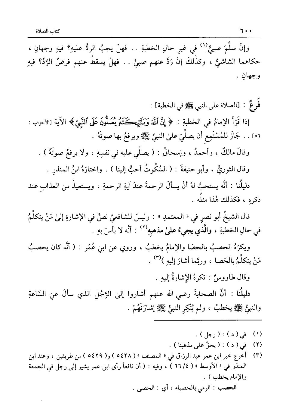 ويكره الحصب بالحصا والإمام يخطب، وروي عن ابن عمر: (أنه كان يحصب من يتكلم بالحصا، وربما أشار إليه) .