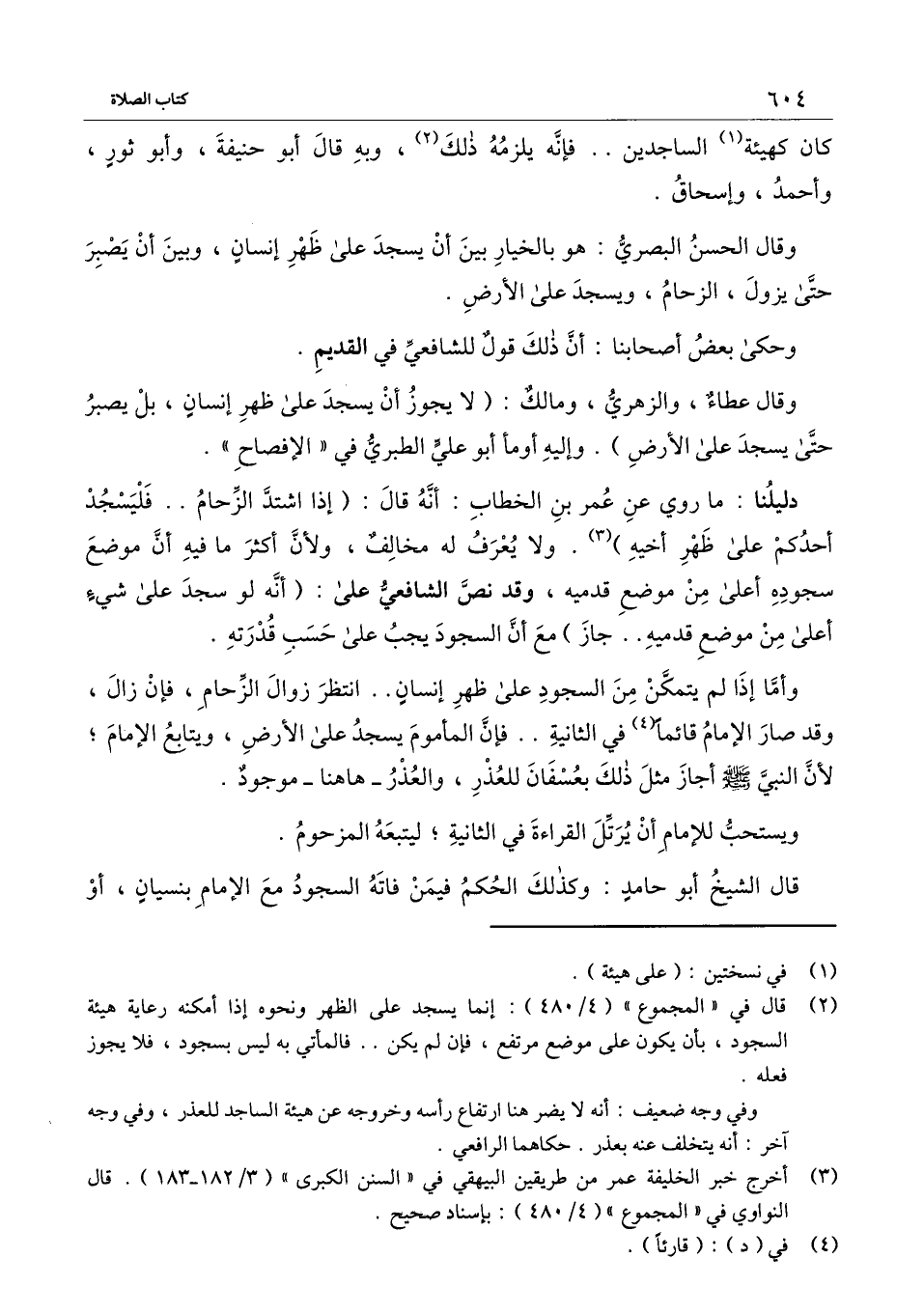 وقال الحسن البصري: هو بالخيار بين أن يسجد على ظهر إنسان، وبين أن يصبر حتى يزول، الزحام، ويسجد على الأرض.