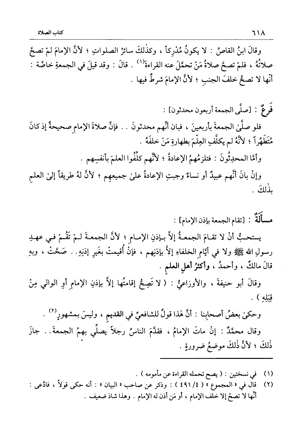 يستحب أن لا تقام الجمعة إلا بإذن الإمام؛ لأن الجمعة لم تقم في عهد رسول الله - صَلَّى اللَّهُ عَلَيْهِ وَسَلَّمَ - ولا في أيام الخلفاء إلا بإذنهم، فإن أُقيمت بغير إذنه ... صحت، وبه قال مالك، وأحمد، وأكثر أهل العلم.