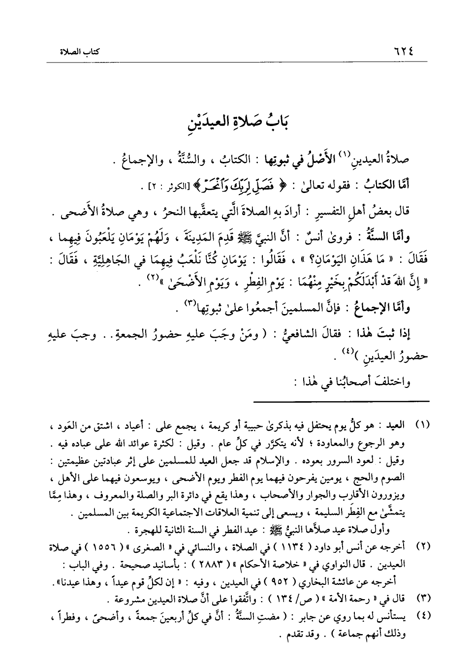 وأما السنة: فروى أنس: «أن النبي - صَلَّى اللَّهُ عَلَيْهِ وَسَلَّمَ - قدم المدينة، ولهم يومان يلعبون فيهما، فقال: "ما هذان اليومان؟ "، فقالوا: يومان كنا نلعب فيهما في الجاهلية، فقال: "إن الله قد أبدلكم بخير منهما: يوم الفطر، ويوم الأضحى» .