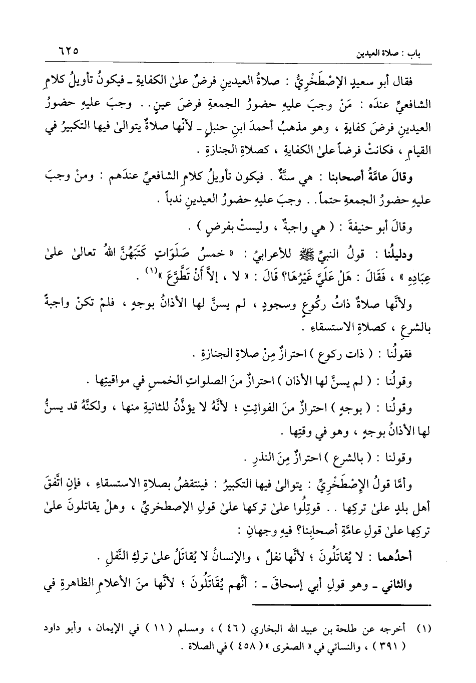 فقال أبو سعيد الإصطخري: صلاة العيدين فرض على الكفاية - فيكون تأويل كلام الشافعي عنده: من وجب عليه حضور الجمعة فرض عين ... وجب عليه حضور العيدين فرض كفاية، وهو مذهب أحمد بن حنبل - لأنها صلاة يتوالى فيها التكبير في القيام، فكانت فرضًا على الكفاية، كصلاة الجنازة.