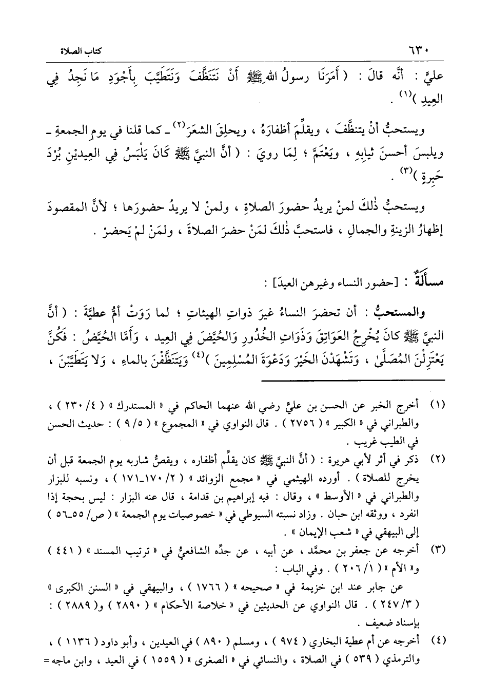 علي: أنه قال: «أمرنا رسول الله - صَلَّى اللَّهُ عَلَيْهِ وَسَلَّمَ - أن نتنظف ونتطيب بأجود ما نجد في العيد» .