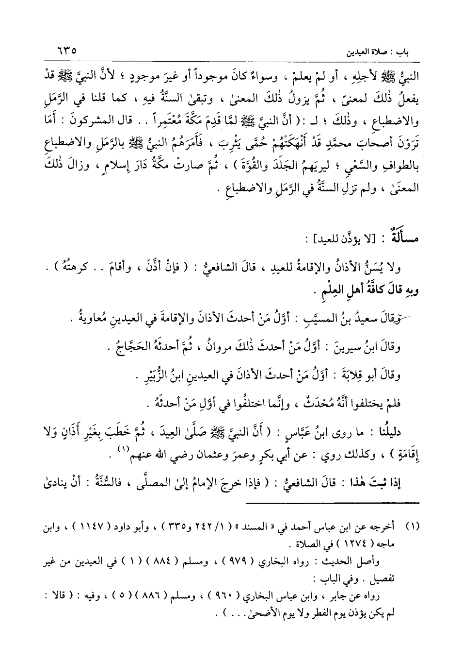 دليلنا: ما روى ابن عباس: «أن النبي - صَلَّى اللَّهُ عَلَيْهِ وَسَلَّمَ - صلى العيد، ثم خطب بغير أذان ولا إقامة» ، وكذلك روي: عن أبي بكر وعمر وعثمان - رَضِيَ اللَّهُ عَنْهُمْ -.