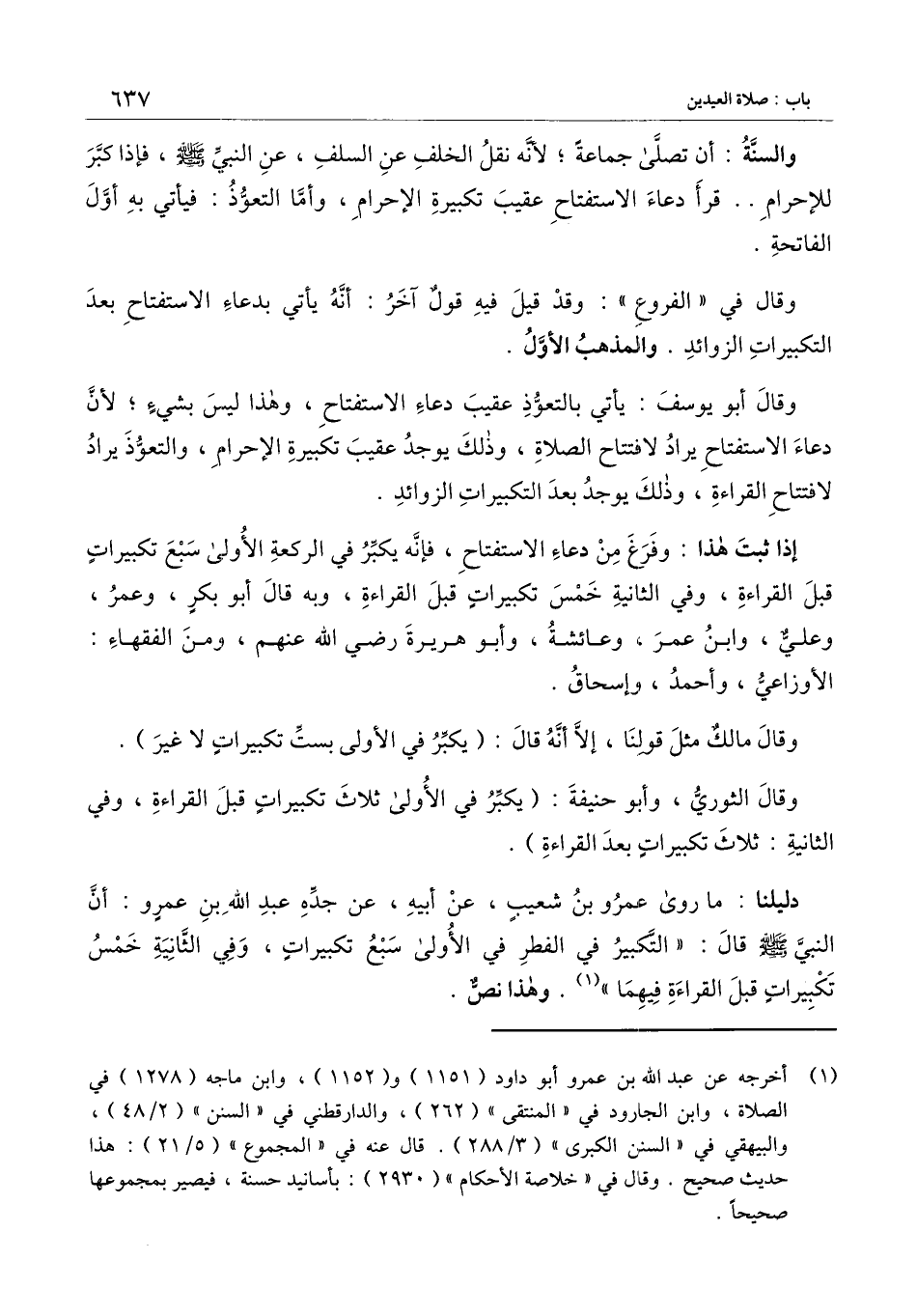 إذا ثبت هذا: وفرغ من دعاء الاستفتاح، فإنه يكبر في الركعة الأولى سبع تكبيرات قبل القراءة، وفي الثانية خمس تكبيرات قبل القراءة، وبه قال أبو بكر، وعمر، وعلي، وابن عمر، وعائشة، وأبو هريرة - رَضِيَ اللَّهُ عَنْهُمْ -، ومن الفقهاء: الأوزاعي، وأحمد، وإسحاق.