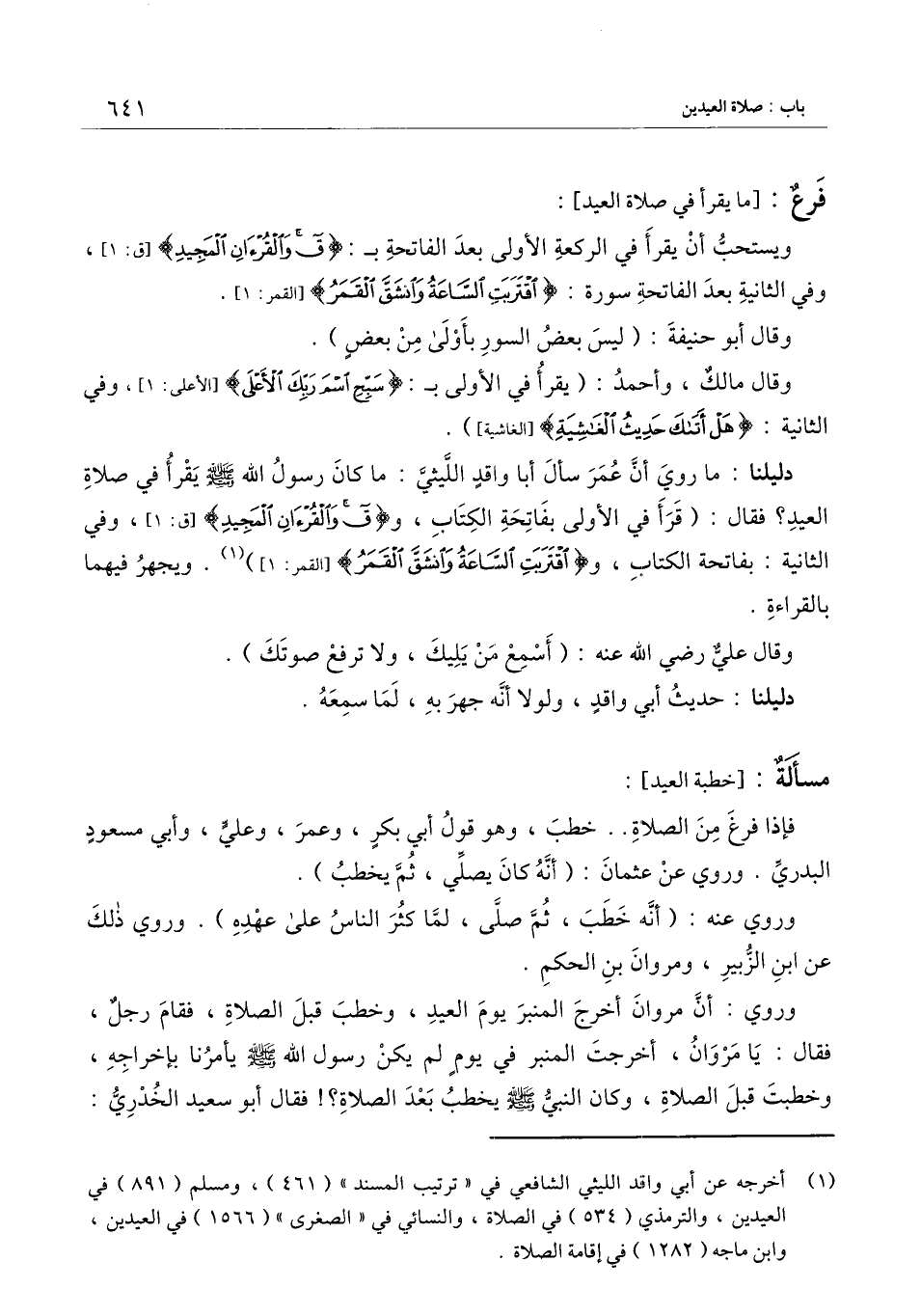 دليلنا: ما «روي أن عمر سأل أبا واقد الليثي: ما كان رسول الله - صَلَّى اللَّهُ عَلَيْهِ وَسَلَّمَ - يقرأ في صلاة العيد؟ فقال: (قرأ في الأولى بفاتحة الكتاب، و {ق وَالْقُرْآنِ الْمَجِيدِ} [ق: 1] [ق:1] ، وفي الثانية: بفاتحة الكتاب، و {اقْتَرَبَتِ السَّاعَةُ وَانْشَقَّ الْقَمَرُ} [القمر: 1] [القمر:1] . ويجهر فيهما بالقراءة» .
