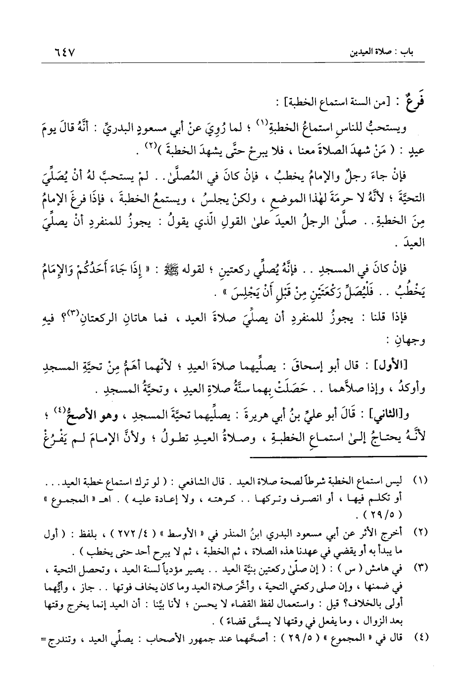 ] : ويستحب للناس استماع الخطبة؛ لما روي عن أبي مسعود البدري: أنه قال يوم عيد: (من شهد الصلاة معنا، فلا يبرح حتى يشهد الخطبة) .