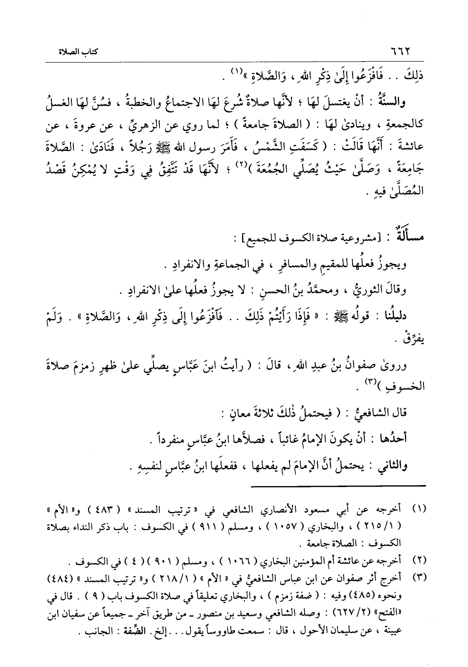والسنة: أن يغتسل لها؛ لأنها صلاة شرع لها الاجتماع والخطبة، فسن لها الغسل كالجمعة، وينادى لها: (الصلاة جامعة) ؛ لما روي عن الزهري، عن عروة، عن عائشة: أنها قالت: «كسفت الشمس، فأمر رسول الله - صَلَّى اللَّهُ عَلَيْهِ وَسَلَّمَ - رجلًا، فنادى: الصلاة جامعة، وصلى حيث يُصلي الجمعة» ؛ لأنها قد تتفق في وقت لا يُمكن قصد المُصلى فيه.