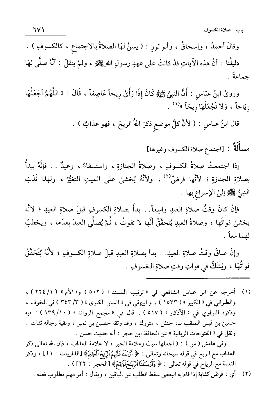 إذا اجتمعت صلاة الكسوف، وصلاة الجنازة، واستسقاء، وعيد ... فإنه يبدأ بصلاة الجنازة؛ لأنها فرض، ولأنه يُخشى على الميت التغير، ولهذا ندب النبي - صَلَّى اللَّهُ عَلَيْهِ وَسَلَّمَ - إلى الإسراع بها.