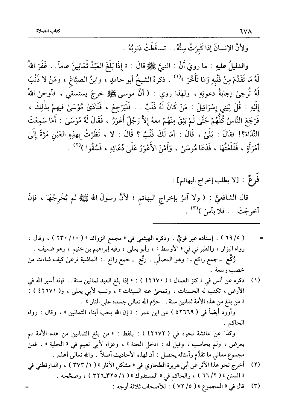 والدليل عليه: ما روي أن: النبي - صَلَّى اللَّهُ عَلَيْهِ وَسَلَّمَ - قال: «إذا بلغ العبد ثمانين عامًا.. غفر الله له ما تقدم من ذنبه وما تأخر» . ذكره الشيخ أبو حامد، وابن الصباغ، ومن لا ذنب له ترجى إجابة دعوته، ولهذا روي: (أن موسى - صَلَّى اللَّهُ عَلَيْهِ وَسَلَّمَ - خرج يستسقي، فأوحى الله إليه: قل لبني إسرائيل: من كان له ذنب.. فليرجع، فنادى موسى فيهم بذلك، فرجع الناس كلهم حتى لم يبقى منهم معه إلا رجل أعور، فقال له موسى: أما سمعت النداء؟! فقال: بلى، قال: أما لك ذنب؟ قال: لا، نظرت بهذه العين مرَّةً إلى امرأة، فقلعتها، فدعا موسى، وأمن الأعور على دعائه، فسقوا) .
