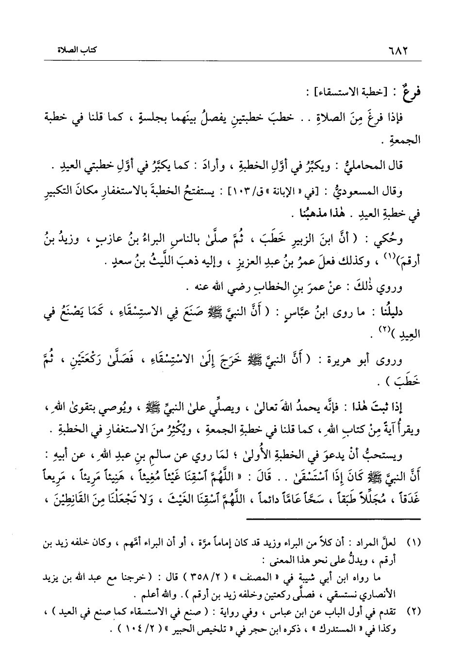 وروى أبو هريرة: «أن النبي - صَلَّى اللَّهُ عَلَيْهِ وَسَلَّمَ - خرج على الاستسقاء، فصلَّى ركعتين، ثم خطب» .