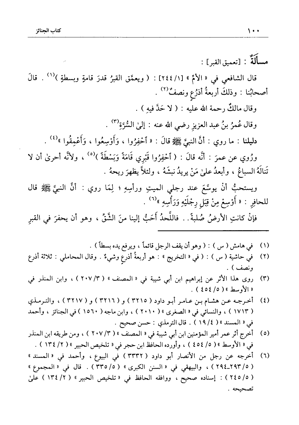 وروي عن عمر: أنه قال: (احفروا قبري قامة وبسطة) ، ولأنه أحرى أن لا تناله السباع، وأبعد على من يريد نبشه، ولئلا يظهر ريحه.