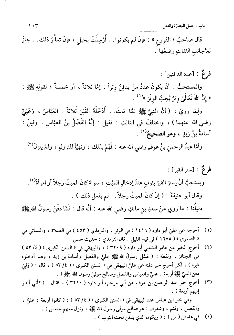 والمستحب: أن يكون عدد من يدفن وترًا: إما ثلاثة، أو خمسة؛ لقوله - صَلَّى اللَّهُ عَلَيْهِ وَسَلَّمَ -: «إن الله تعالى وتر يحب الوتر» .