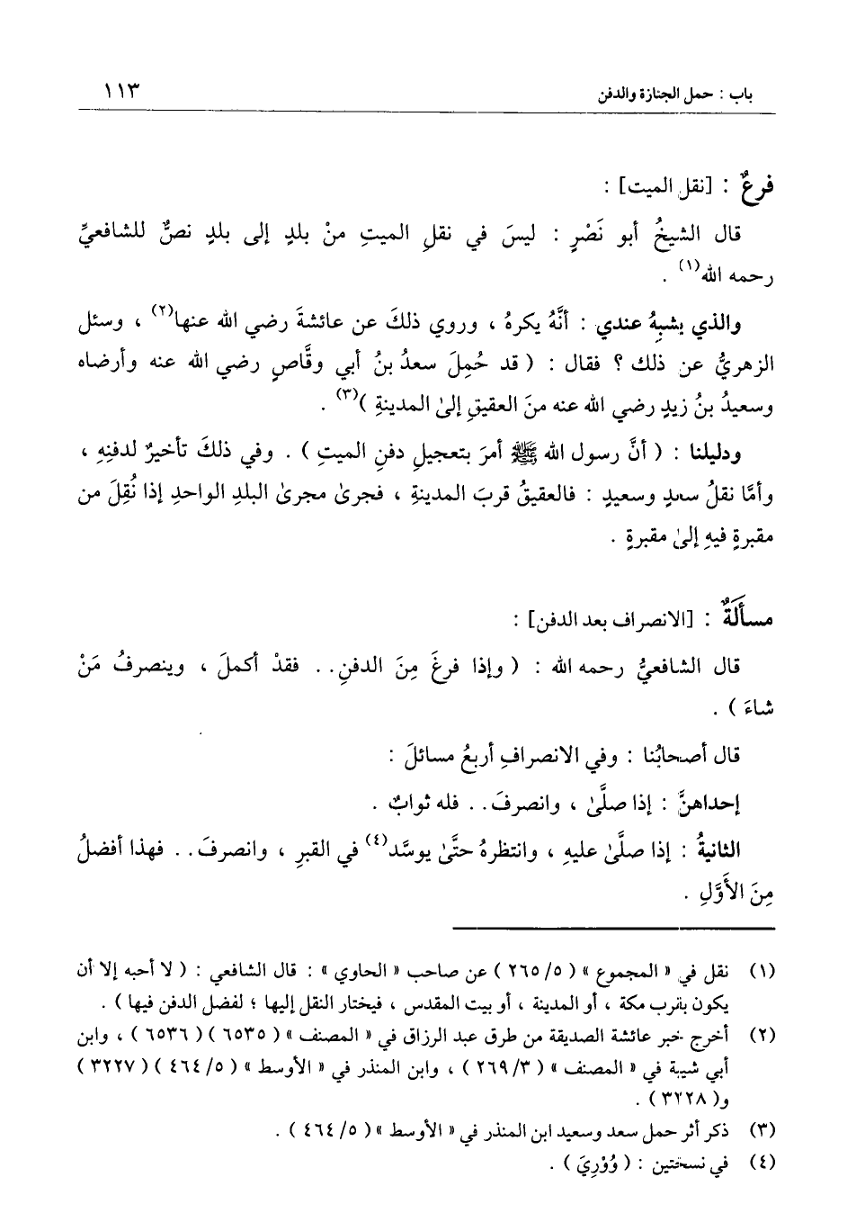 قال أصحابنا: وفي الانصراف أربع مسائل: