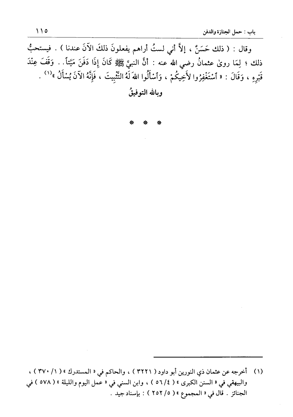 وقال: (ذلك حسن، إلا أني لست أراهم يفعلون ذلك الآن عندنا) . فيستحب ذلك؛ لما روى عثمان - رَضِيَ اللَّهُ عَنْهُ -: «أن النبي - صَلَّى اللَّهُ عَلَيْهِ وَسَلَّمَ - كان إذا دفن ميتًا ... وقف عند قبره، وقال: "استغفروا لأخيكم، واسألوا الله له التثبيت، فإنه الآن يسأل» .
