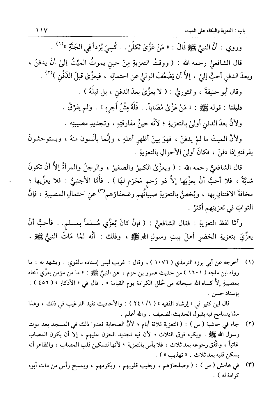 وروي: أن النبي - صَلَّى اللَّهُ عَلَيْهِ وَسَلَّمَ - قال: «من عزى ثكلى ... كسي بردًا في الجنة» .