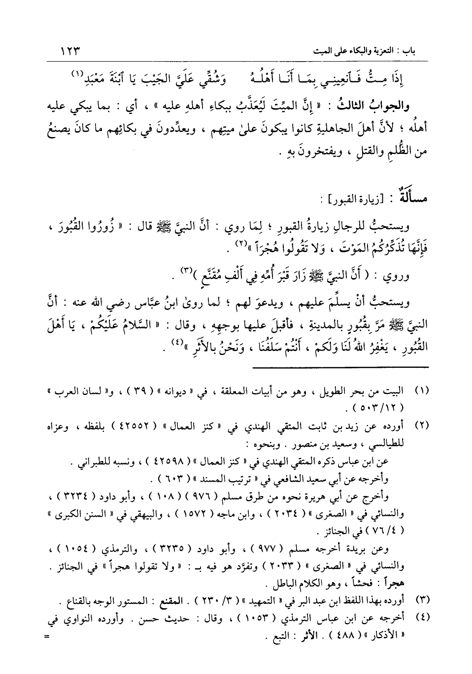 ] : ويستحب للرجال زيارة القبور؛ لما روي: أن النبي - صَلَّى اللَّهُ عَلَيْهِ وَسَلَّمَ - قال: «زوروا القبور، فإنها تذكركم الموت، ولا تقولوا هجرًا» .