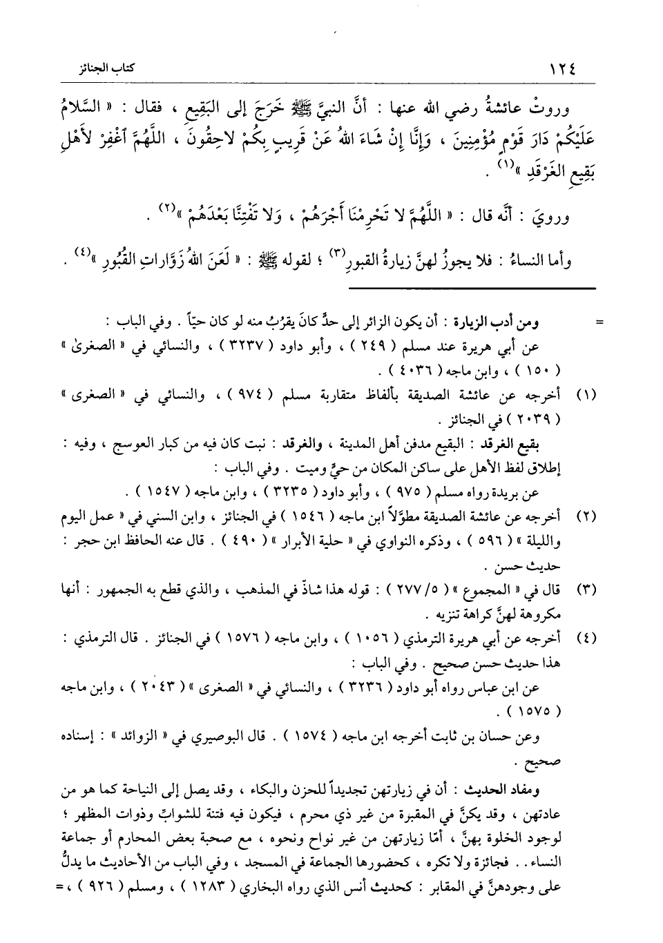 وأما النساء: فلا يجوز لهن زيارة القبور؛ لقوله - صَلَّى اللَّهُ عَلَيْهِ وَسَلَّمَ -: «لعن الله زوارات القبور» .