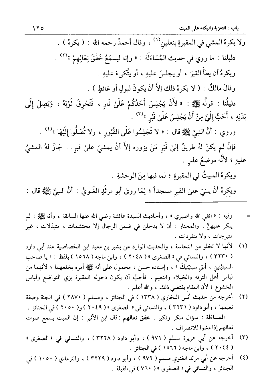 ولا يكره المشي في المقبرة بنعلين، وقال أحمد - رَحِمَهُ اللَّهُ -: (يكره) .