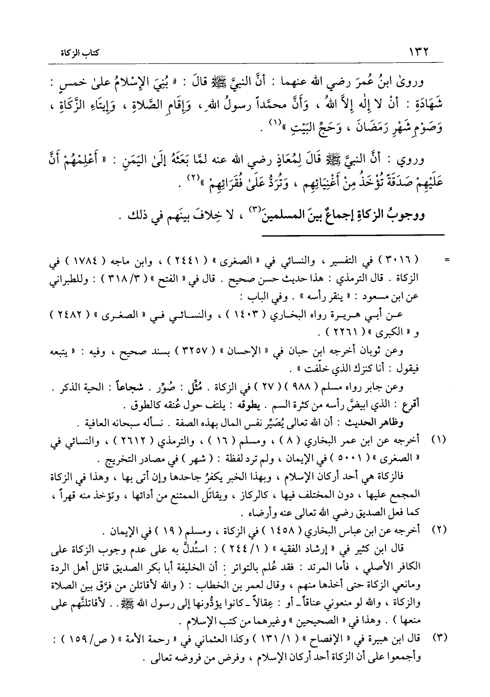 وروى ابن عمر - رَضِيَ اللَّهُ عَنْهُمَا -: أن النبي - صَلَّى اللَّهُ عَلَيْهِ وَسَلَّمَ - قال: «بني الإسلام على خمس: شهادة أن لا إله إلا الله، وأن محمدًا رسول الله، وإقام الصلاة، وإيتاء الزكاة، وصوم شهر رمضان، وحج البيت» .