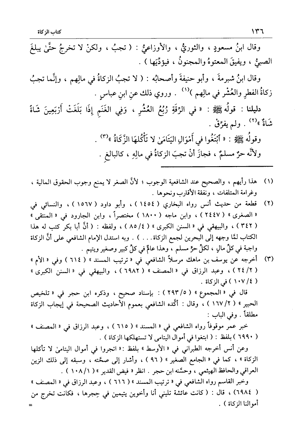 وقال ابن مسعود، والثوري، والأوزاعي: (تجب، ولكن لا تخرج حتى يبلغ الصبي، ويفيق المعتوه والمجنون، فيؤديها) .