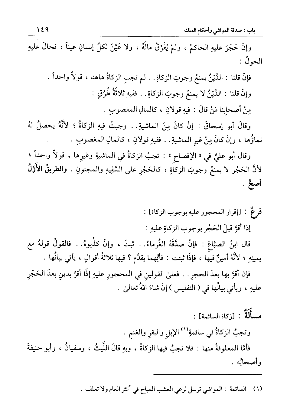 وقال أبو علي في " الإفصاح ": تجب الزكاة في الماشية وغيرها، قولا واحدا؛ لأن الحجر لا يمنع وجوب الزكاة، كالحجر على السفيه والمجنون. والطريق الأول أصح.