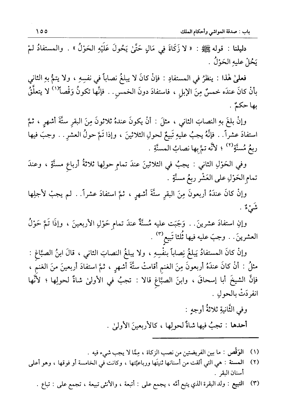 وإن بلغ به النصاب الثاني، مثل: أن يكون عنده ثلاثون من البقر ستة أشهر، ثم استفاد عشرا. فإنه يجب عليه تبيع لحول الثلاثين، وإذا تم حول العشر.. وجب فيها ربع مسنة؛ لأنه تم بها نصاب المسنة.