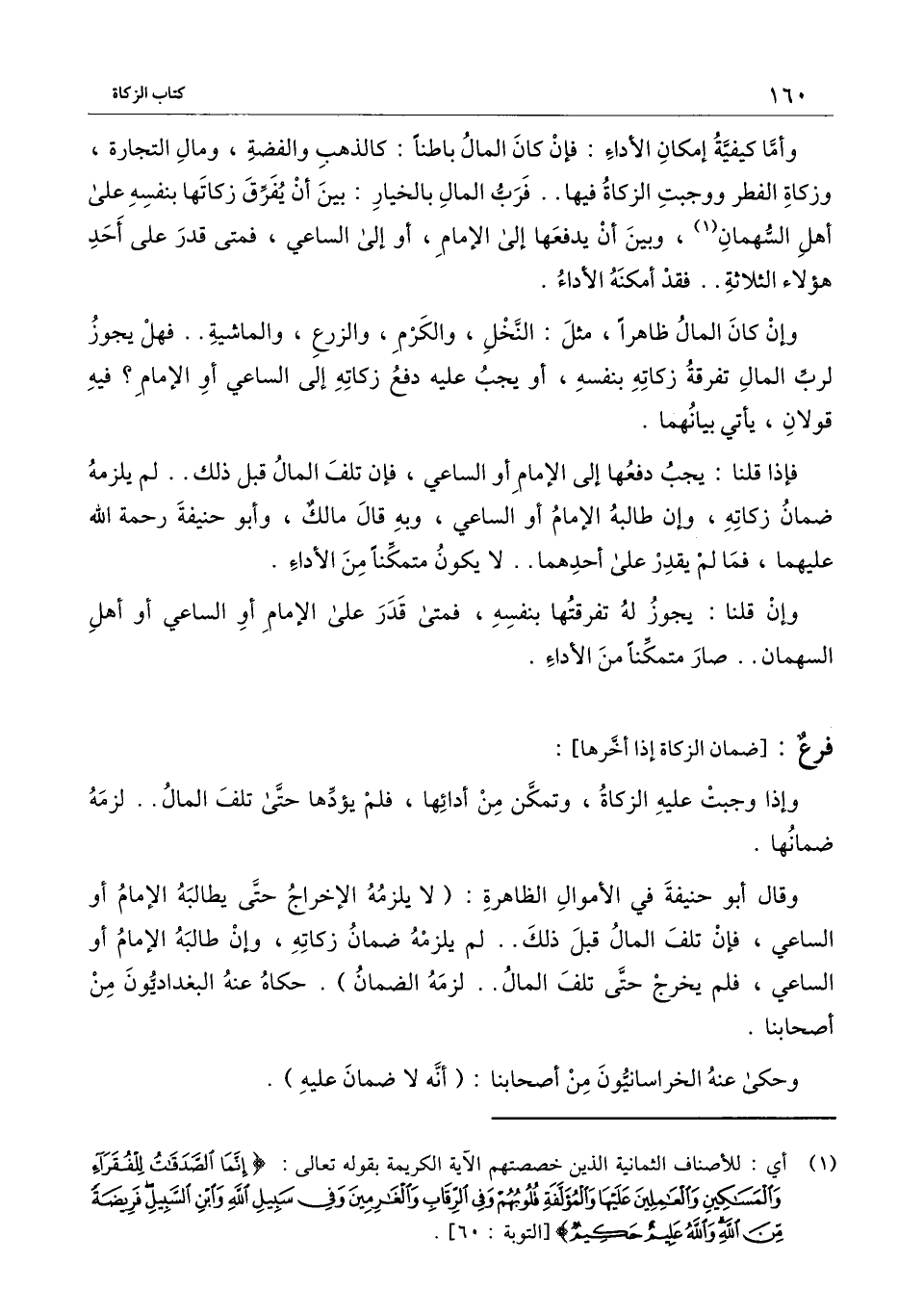 وقال أبو حنيفة في الأموال الظاهرة: (لا يلزمه الإخراج حتى يطالبه الإمام أو الساعي، فإن تلف المال قبل ذلك.. لم يلزمه ضمان زكاته، وإن طالبه الإمام أو الساعي، فلم يخرج حتى تلف المال.. لزمه الضمان) . حكاه عنه البغداديون من أصحابنا.
