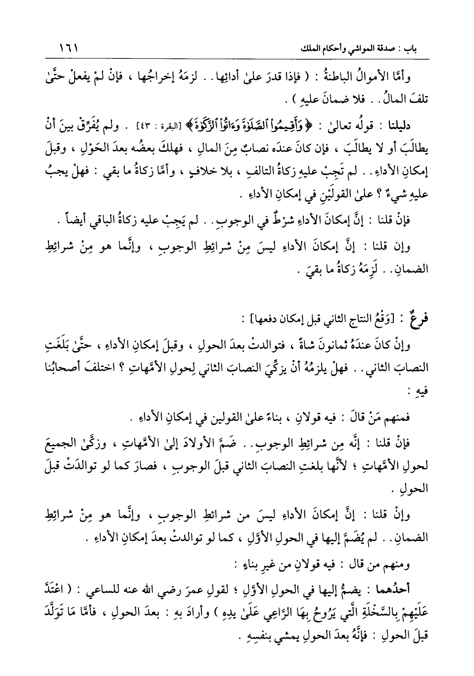 ] : وإن كان عنده ثمانون شاة، فتوالدت بعد الحول، وقبل إمكان الأداء، حتى بلغت النصاب الثاني.. فهل يلزمه أن يزكي النصاب الثاني لحول الأمهات؟ اختلف أصحابنا فيه: