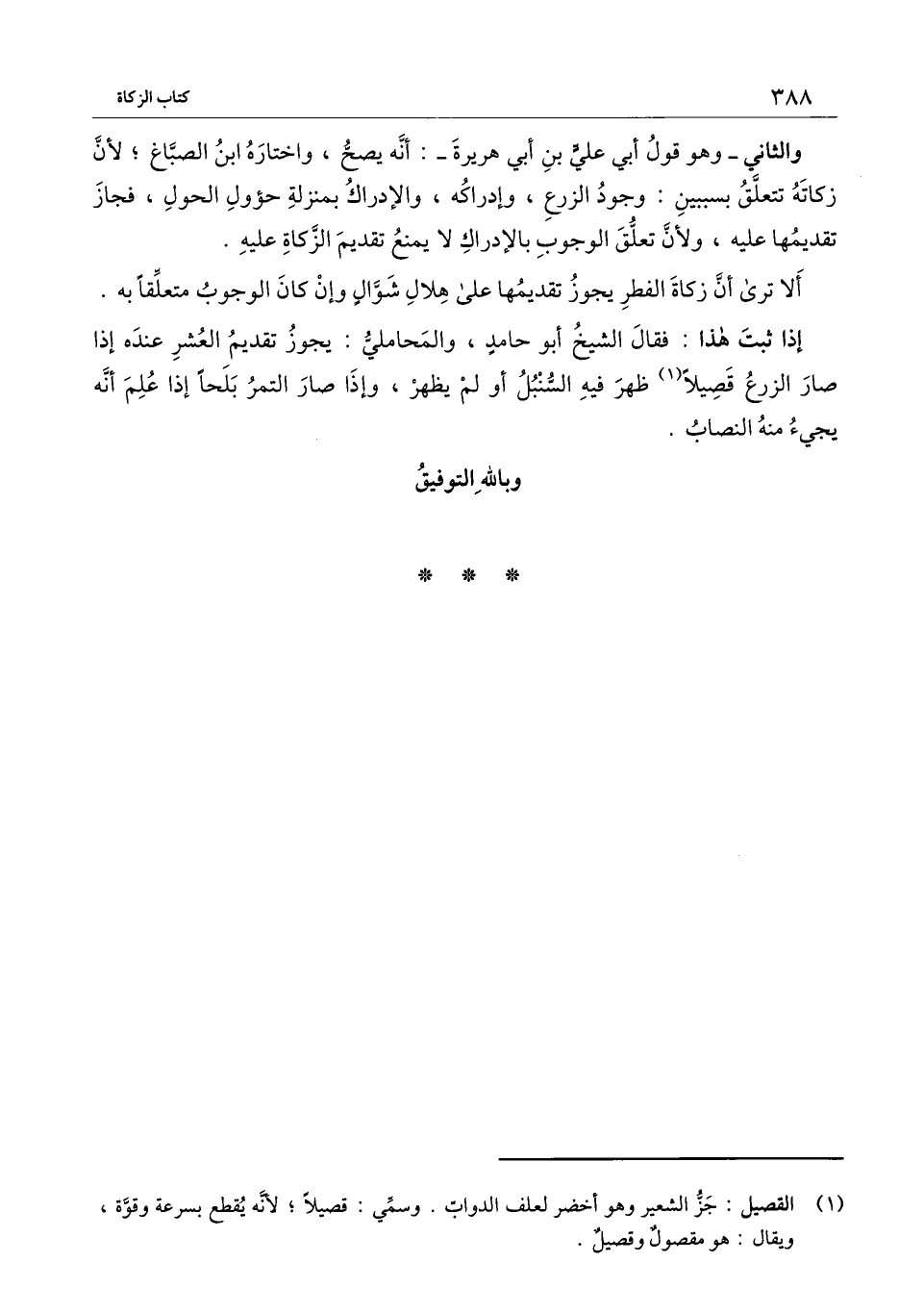 إذا ثبت هذا: فقال الشيخ أبو حامد، والمحاملي: يجوز تقديم العشر عنده إذا صار الزرع قصيلا ظهر فيه السنبل أو لم يظهر، وإذا صار التمر بلحا إذا علم أنه يجيء منه النصاب.
