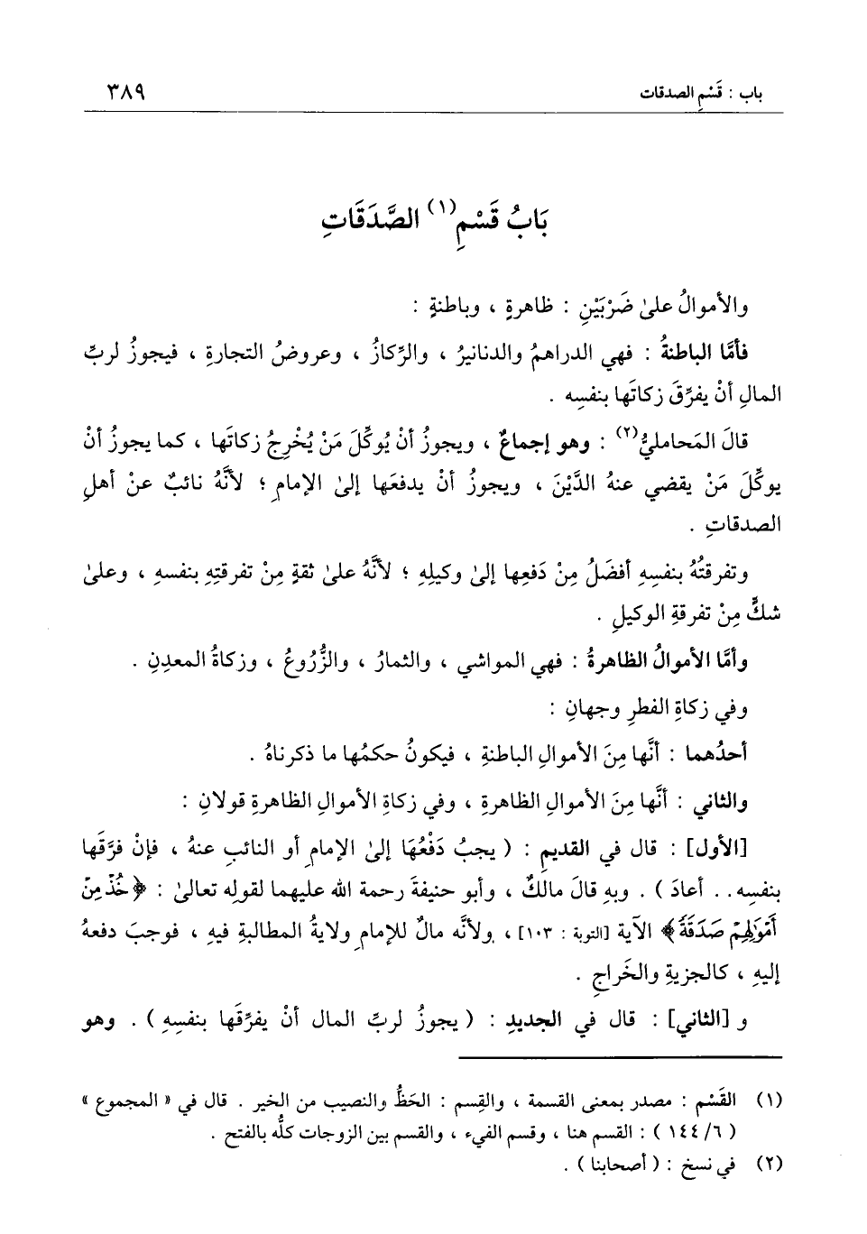 [الأول] : قال في القديم: (يجب دفعها إلى الإمام أو النائب عنه، فإن فرقها بنفسه.. أعاد) . وبه قال مالك، وأبو حنيفة - رحمة الله عليهما - لِقَوْلِهِ تَعَالَى: {خُذْ مِنْ أَمْوَالِهِمْ صَدَقَةً} [التوبة: 103] الآية [التوبة: 103] ، ولأنه مال للإمام ولاية المطالبة فيه، فوجب دفعه إليه، كالجزية والخراج.